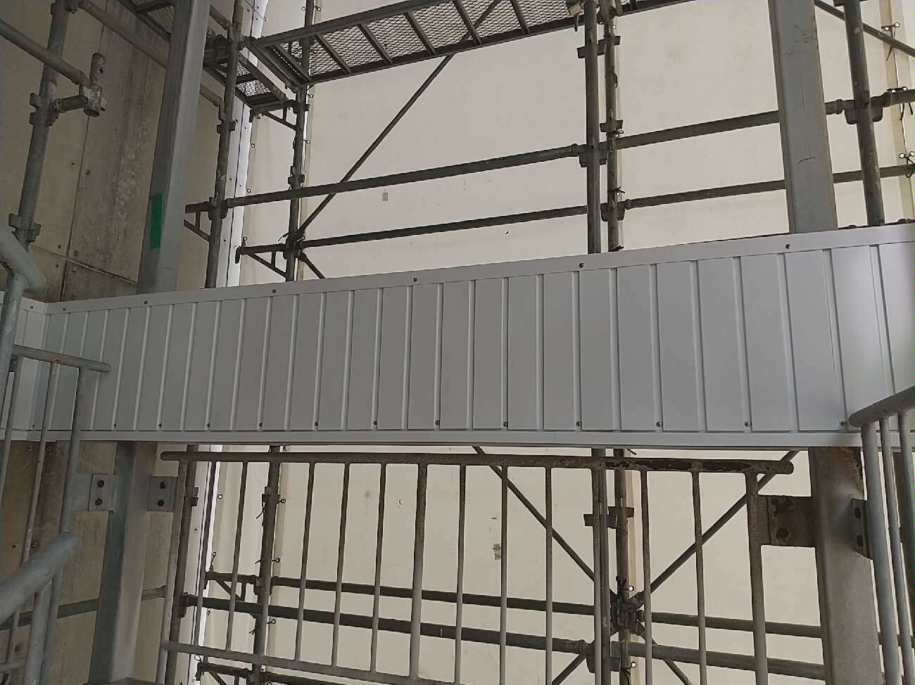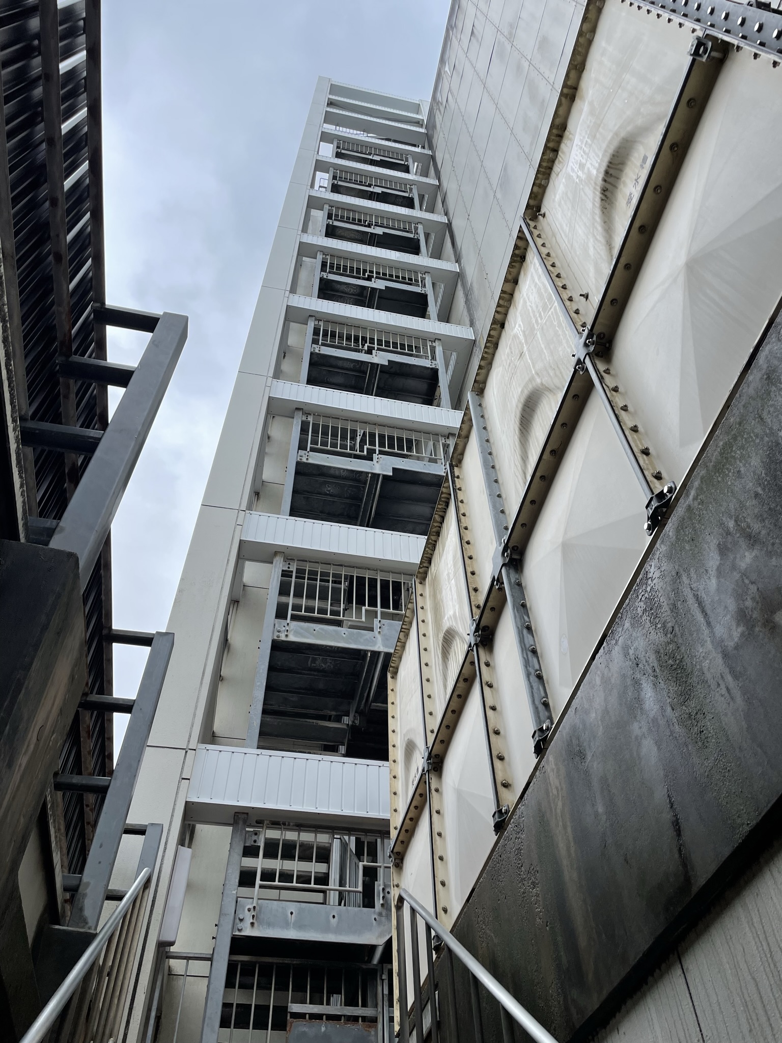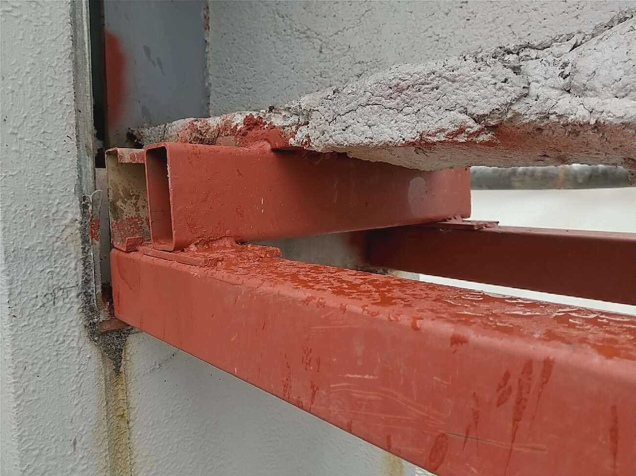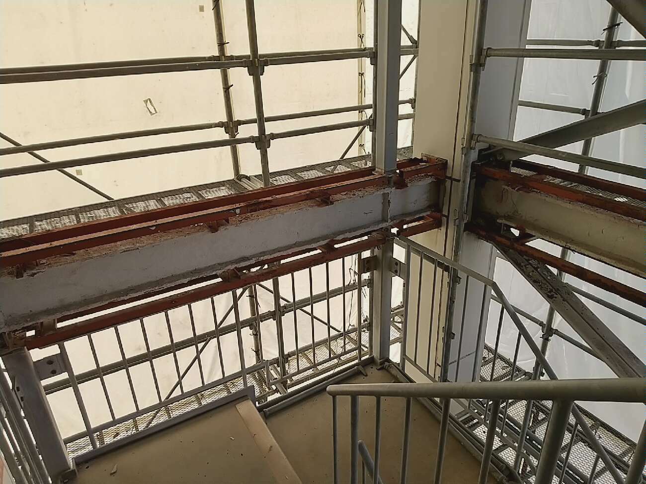 マンションの外壁の一部が剥離・落下したということで連絡があり、調査を行ったところ、階段室の鉄骨の現わしが腐食をしているため、下地のビスが効かなくなったことが原因ということが分かりました。